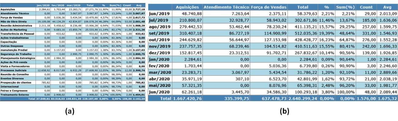 The choice of a pie chart for columns and a bar chart for rows was just a personal preference. The pie chart highlights the contribution of each column to the result, i.e., treats columns as categories. However, the row data is temporal, and the bar chart illustrates how the numbers change over time. However, one might consider the opposite as a better approach: a pie chart to indicate progress over time and a bar chart to compare participation in categories. Otherwise, using the same type of chart facilitates comparing row and column data. All these scenarios are easily achieved by replacing the contents of the facets or creating facets. From the insights provided by the overview facets, it is possible to generate segmented visualizations like "zoom and filter". For example, in figure 3.18, (a) shows a quarterly review (rows), while (b) shows three selected categories. Calculations are done only for the selected dataset.